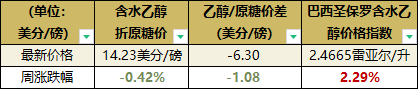巴西5月含水乙醇消費量同比大增52.6%,1-5月累計消費量同比增長 56.2%,創下2008年以來同期最好記錄。受需求強勁及糖廠挺價支撐,巴西含水乙醇價格連續第三周上漲,圣保羅含水乙醇指數收于每升2.4665 雷亞爾,周環比上漲 2.29%。而巴西雷亞爾兌美元匯率貶值給含水乙醇折算原糖價格帶來壓力,最新價格為14.23美分/磅,周跌幅0.42%。