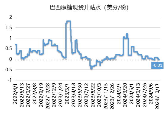 近期,巴西原糖(VHP)現貨對3月期貨合約貼水1個點(11月船期),較10月中旬下降5個點。巴西中南部10月上半月的產量數據略高于此前分析師的預估中值,糖廠迅速收榨的可能性降低,目前市場對于本榨季糖產量的預估傾向于區間上沿,高于3900萬噸的水平。