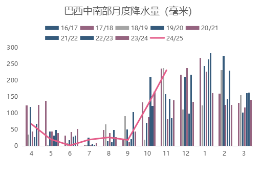 從24/25榨季尾聲產量超預期的情況看,巴西的甘蔗面積以及糖產能之前受到低估,加上10月份以來主產區降水改善,11月份降水更是達到最近6年同期最高水平,目前市場對25/26榨季的產量前景樂觀,甘蔗壓榨量及產糖量或與本榨季水平接近。