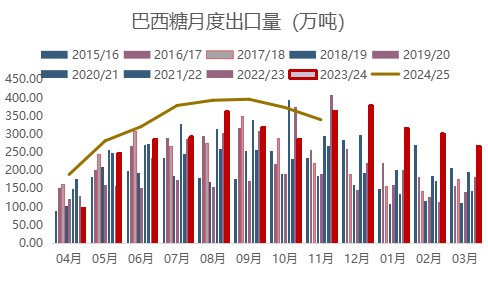 11月巴西糖出口較10月份有所放慢,同比減少6.9%,但仍保持在300萬噸以上水平,為339.1萬噸。2024/25榨季4-11月巴西已累計出口糖2668萬噸,同比增加18.21%。