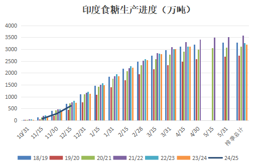 根據印度全國合作糖廠聯合會有限公司(NFCSF)發布的數據,2024-25年度截至2024年12月15日全國472家糖廠開榨,同比減少29家,累計壓榨甘蔗7192.4萬噸,同比減少15.5%,產糖608.5萬噸,同比減少18%。 截至2024年12月15日,平均產糖率為8.46%,低于上榨季同期的8.72%。預計12月下旬產量的同比差距會進一步縮小。