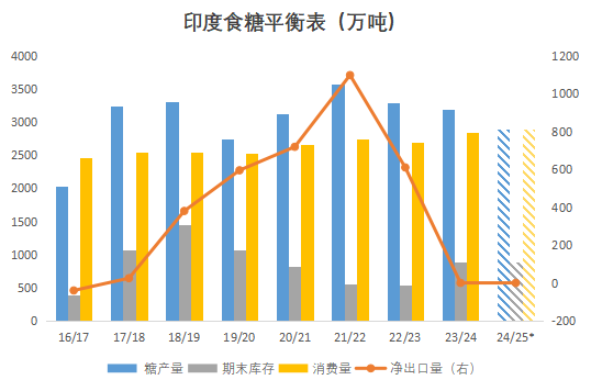 就消費量而言,印度10月至12月發放的銷售配額比去年同期減少了65萬噸左右,或與經濟放緩有所關聯,因此預計本年度的食糖消費增速放緩,消費量或為2900萬噸,與23/24榨季的2890萬噸幾乎持平。