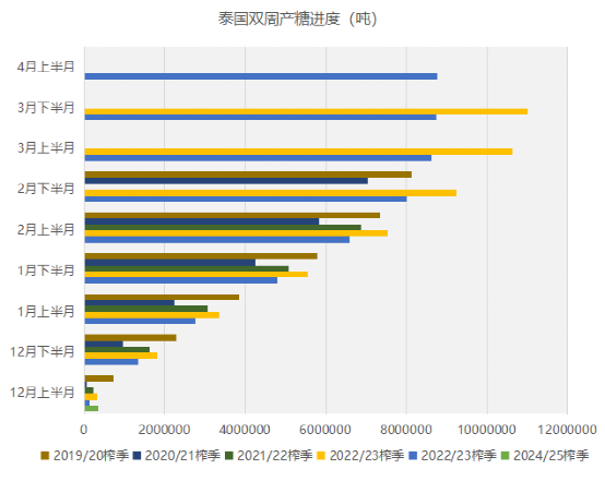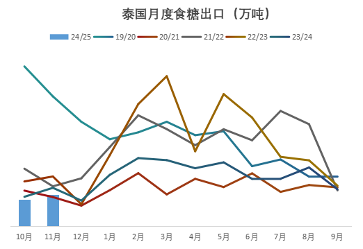根據海關數據,泰國11月出口糖22.24萬噸,同比減少17.5%,24/25榨季10-11月累計出口糖共計出口糖41.6萬噸,同比減少12.6%,預計12月份出口將增加。自12月初泰國開榨以來現貨升水報價承壓,12月船期的泰國原糖現貨升水下降至120個點左右,而有關中國可能暫停從泰國進口液體糖和預混糖的消息也導致泰國精制糖現貨報價持續下降,關注后期政策變化對泰國糖需求的潛在影響。