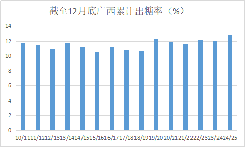 截至12月底的數據顯示,來賓、南寧兩大產區出糖率同比增幅近1個百分點,柳州甚至達到近1.4%,不過崇左增幅只有0.22%。如果最大產區崇左增幅不大的話,全區產量增幅估計有限。此次調研之后我們把24/25榨季廣西糖產量預估下調至650萬噸左右,目前廣西收榨進度提前幅度超預期,估產可能還將進一步調整。