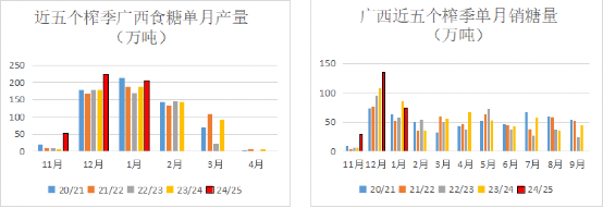 1月廣西已收榨三家糖廠,累計日產(chǎn)能減少16000噸,2月份預計收榨糖廠超過30家,其中崇左13家糖廠收榨8家,且均是大產(chǎn)能糖企,來賓預計收榨超過一半。再考慮春節(jié)生產(chǎn)期間的停機或檢修,預計廣西月產(chǎn)量可能比最高產(chǎn)量下降一半或以上。對銷量依然不悲觀,主要是加工糖難以大量供應市場,國內(nèi)依然會以國產(chǎn)糖銷售為主,但考慮到連續(xù)三個月放量,2月的產(chǎn)銷進度或?qū)⒎啪彙?傮w看,累庫進度并不算快,國內(nèi)的產(chǎn)銷節(jié)奏預計保持中性偏好。
