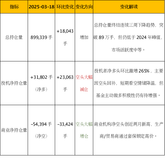 投機者大幅增持凈多頭(+31,802手),而商業機構凈空頭同步擴大(-54,394手)。商業機構(生產商/貿易商)大幅套保,可能隱含對未來供過于求或價格下跌的預期。基金空頭大幅撤離但多頭增倉有限,反映基金對趨勢延續性存疑,短期價格波動可能收窄。