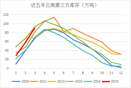 從全國、廣西工業庫存及廣西、云南第三方庫存數據看,工業庫存的拐點往年要在四月后出現,今年三月份全國庫存就已經拐頭向下,國產糖已停止累庫進入去庫周期。第三方倉庫庫存的拐點預計仍要四月后出現,但廣西同比增產28萬噸,庫存增加19.61萬噸,去庫速度快于同期。云南產糖量預計增加23萬噸,截至3月末第三方庫存同比增加21.25萬噸,累庫量略高于廣西,拐點預計要到五月后出現。如若后期國產糖繼續保持當下的去庫速度,整體庫存的壓力將小于去年。