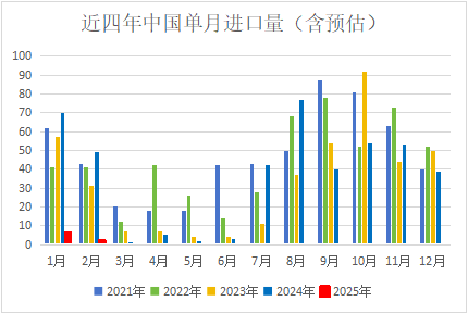 2025年1-2月,我國進口糖量僅8萬噸,幾乎可忽略不計,糖漿及預混粉進口量也僅10.93萬噸,預計3月14日后越南的糖漿及預混粉也暫停進口,4月的進口量仍將進一步減少。而進口糖因清關的原因,預計1-2月到港糖會有部分計入3月數據中,或在15-20萬噸左右,總體預計3月進口糖數據會在20萬噸或以上。