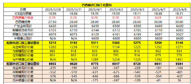 當前,國際國內糖市暫無實質利空,但卻表現出兩種走勢。國內易漲難跌,支撐強勁,但波幅收窄;國際震蕩下跌至前期平臺低位,波幅大于國內。或許國際受到宏觀情緒的影響,并提前交易后期供應量增加。但巴西庫存低位,從當前的情況看4月份新糖上市的量還存在炒作的空間,短期內外盤繼續下跌的空間很有限。雖然關稅政策引起市場巨大波瀾,但目前看傳遞到糖市的影響甚小,而原油在急速下跌后預計會得到一定的震蕩修復,傳導至乙醇的作用可能并沒有那么明顯。后期重點關注4月巴西新糖上市量是否超預期,否則國際糖價預計仍在18-20美分的區間震蕩。