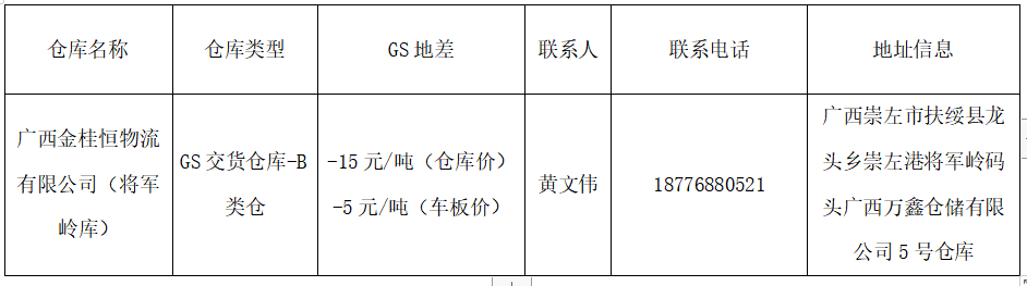 由于倉庫方新增庫點,經本公司研究決定,將廣西金桂恒物流有限公司(將軍嶺庫)的庫點設為GS-B類交收倉庫,從即可起執行,具體信息如下: