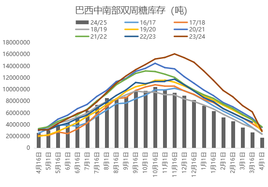 巴西本榨季的食糖減產以及大量出口提前導致庫存達到低點,本榨季截至3月底巴西中南部工業糖庫存降至185萬噸的歷史同期最低水平,同比減少100萬噸。庫存告急也使得巴西4月糖出口降至23年4月以來的最低月度水平,僅為155.26萬噸,同比減少18%。預計這樣偏緊的供應狀況可能持續至6月份。