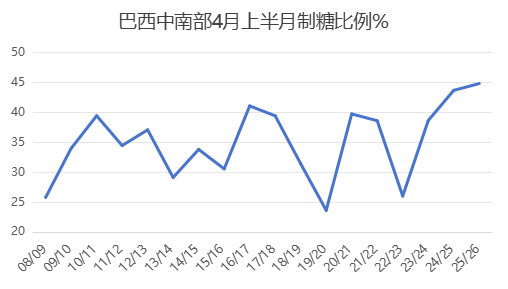 巴西中南部25/26榨季(25年4月-26年3月)截至4月上半月累計已有178家糖廠開榨,同比增加3家。甘蔗壓榨量及糖產量均分別同比小幅增加3%和1%,不僅生產進度快于市場預期,制糖甘蔗比也達到44.77%的歷史同期新高,反應新制糖產能上線及玉米乙醇產量增加令糖醇比天平進一步向糖傾斜。巴西開榨以來,糖醇價差仍保持在3-4美分/磅,產糖收益高于乙醇,加上4月上半月39%的乙醇由玉米產出,去年同期僅為27%,兩個因素共同強化了本榨季甘蔗制糖比例達到高位的前景。
