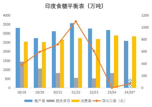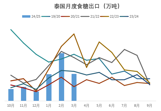 受需求疲弱影響,泰國3月份糖出口較2月驟降33萬噸,至43萬噸,同比亦減少4萬噸。24/25榨季10-25年3月累計出口糖217萬噸,同比增加約20萬噸。預計本榨季泰國的可供出口量將到達約650萬噸,同比增加200多萬噸,關注后期主要進口國需求的恢復情況。