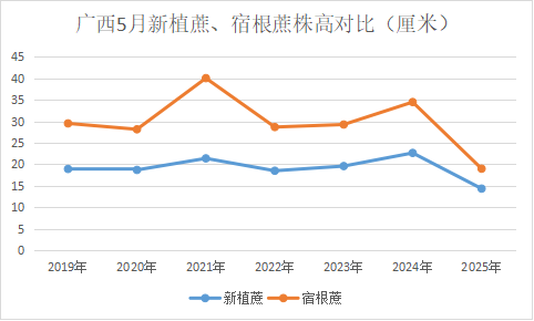 從5月廣西蔗區(qū)調(diào)研情況看,得益于最近豐沛的降雨量及大部份田地及時(shí)補(bǔ)苗,當(dāng)前甘蔗雖然同比較差,但是出苗率好于預(yù)期,但長(zhǎng)勢(shì)偏矮、苗情不齊、地區(qū)差異很大,甚至是由于砍收時(shí)間、坡地洼地、田間護(hù)理等原因,相鄰地塊的長(zhǎng)勢(shì)差異都很大。由于新補(bǔ)種地塊植期較晚預(yù)計(jì)留作種子的可能性較大,但對(duì)總面積的影響不大。總體看,拔節(jié)期生長(zhǎng)滯后約一個(gè)月,每畝含株數(shù)略少,生長(zhǎng)量不足。當(dāng)前出苗數(shù)與株高同比下降,給25/26榨季開了一個(gè)不好的開局。