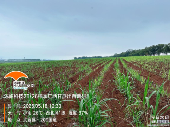本次調(diào)研以主產(chǎn)區(qū)實(shí)地調(diào)研以及測(cè)量為主,調(diào)查主要以隨機(jī)測(cè)量10米長(zhǎng)度距離內(nèi)相鄰4行范圍內(nèi)的平均蔗芽數(shù),并且測(cè)量相鄰5行甘蔗的行距,以此估算出調(diào)研地塊的每畝甘蔗苗數(shù),了解新植蔗萌芽出苗以及宿根蔗發(fā)株的基本情況。同時(shí)測(cè)量每塊蔗地相鄰10株苗的高度,從而得出當(dāng)前甘蔗生長(zhǎng)情況的基本評(píng)估。