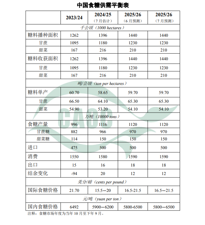 本月對2025/26年度食糖供需形勢預測與上月保持一致。廣西秋冬春連旱對甘蔗出苗和前期生長產生不利影響,甘蔗長勢和株數較去年同期偏矮偏少。甜菜長勢總體良好,但內蒙古產區近期降水偏多,易發生病蟲害,需提前防治。國際方面,后期需繼續關注巴西產糖進度和北半球糖料生長情況。