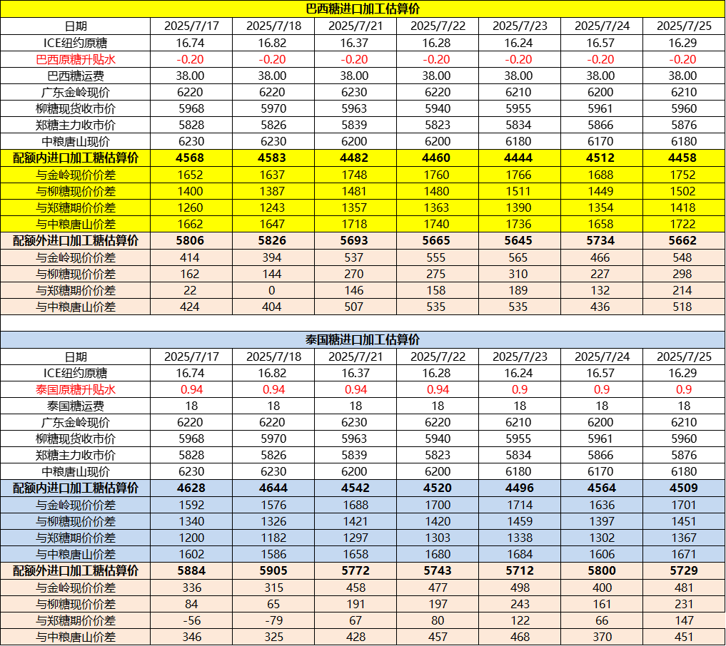 巴西泰國進(jìn)口糖升貼水、運(yùn)費(fèi)及加工成本(7月28日更新)