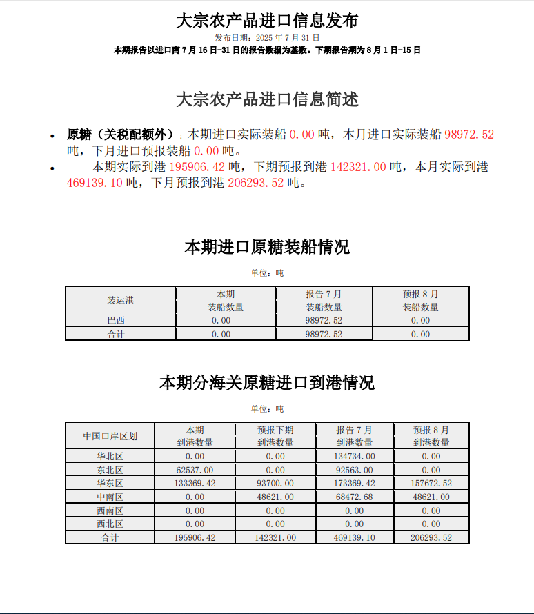 商務(wù)部 :7月關(guān)稅配額外原糖實際到港46.91萬噸,8月預(yù)報到港20.63萬噸