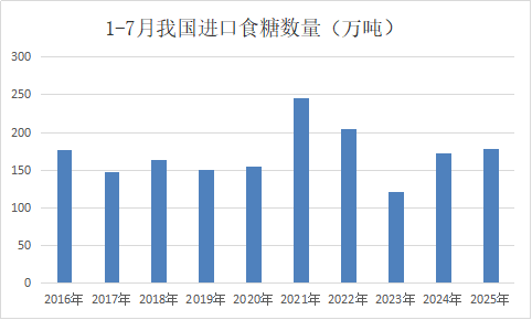 2025年1-7月我國累計進口食糖179萬噸,同比增加7萬噸,從近十年同期最低水平躍升至第三高的水平。其中白糖16.84萬噸,原糖161.25萬噸。24/25榨季截至7月底我國累計進口食糖325萬噸,同比減少33萬噸。