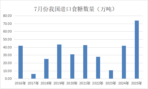 海關總署公布的數據顯示,2025年7月份我國進口食糖74萬噸,同比增加32萬噸,繼續保持在近十年同期最高水平,比次高還多30萬噸左右。其中白糖3.98萬噸,原糖70.45萬噸。