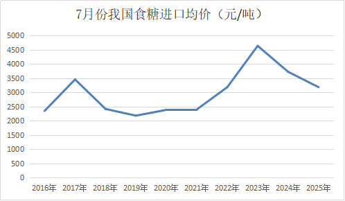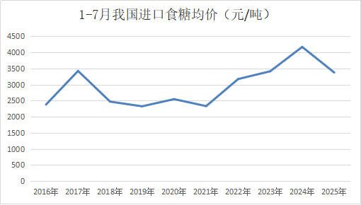 2025年1-7月我國進口食糖均價為3377元/噸(到岸價),同比大幅下降795元/噸,降至近十年同期第四高的水平,今年以來累計進口均價逐月下降。