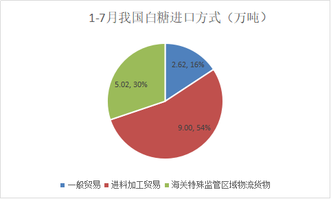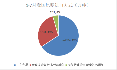 2025年1-7月我國進口食糖179萬噸,其中白糖16.84萬噸,進口方式主要是進料加工貿易9萬噸,其次是海關特殊監管區域物流貨物5萬噸,第三是一般貿易只有2.62萬噸;原糖161.25萬噸,大部分105.92萬噸通過一般貿易進口,占比66%,其次47.95萬噸為保稅監管場所進出境貨物,占比30%,還有7.21萬噸海關特殊監管區域物流貨物,占比4%。7月份進口的約70萬噸原糖大部分55萬噸通過一般貿易進口,另外新增15萬噸保稅監管場所進出境貨物,海關特殊監管區域物流貨物沒有繼續增加。