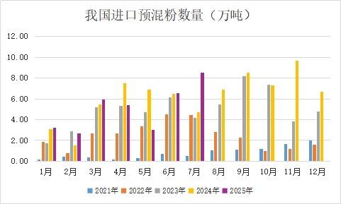 2025年1-7月我國17029012項下進口預(yù)混粉8.86萬噸,其中從越南進口最多7.45萬噸,其次從泰國進口0.94萬噸,以及從馬來西亞進口0.13萬噸;同期21069062項下進口預(yù)混粉26.51萬噸,絕大部分26.14萬噸從泰國進口。