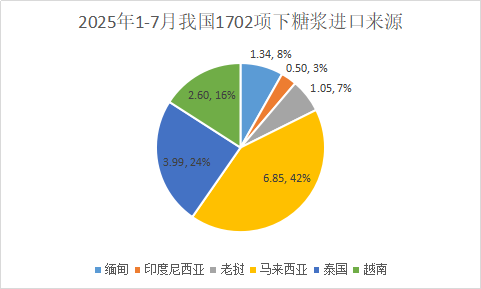 2025年1-7月我國17029011項下進口糖漿16.42萬噸,其中從馬來西亞進口的數(shù)量躍升至第一6.85萬噸,第二為泰國3.99萬噸,第三為越南2.6萬噸,還有從緬甸、老撾和印度尼西亞分別進口1.34萬噸、1萬噸以及0.5萬噸;同期21069061項下進口糖漿9.39萬噸,絕大部分9.11萬噸從泰國進口。