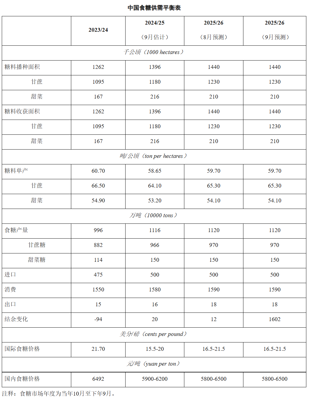 本月對中國食糖供需形勢預測與上月保持一致。南方產區光熱充足、雨水豐沛,甘蔗長勢總體良好;新疆甜菜產區受干旱影響,單產略有下降;內蒙古中西部地區降雨偏多,甜菜含糖分下降,甜菜起收受影響,糖廠開機時間推遲。巴西食糖生產進度加快,市場維持產大于消預估,國際糖價在近4年低點上方弱勢震蕩。
