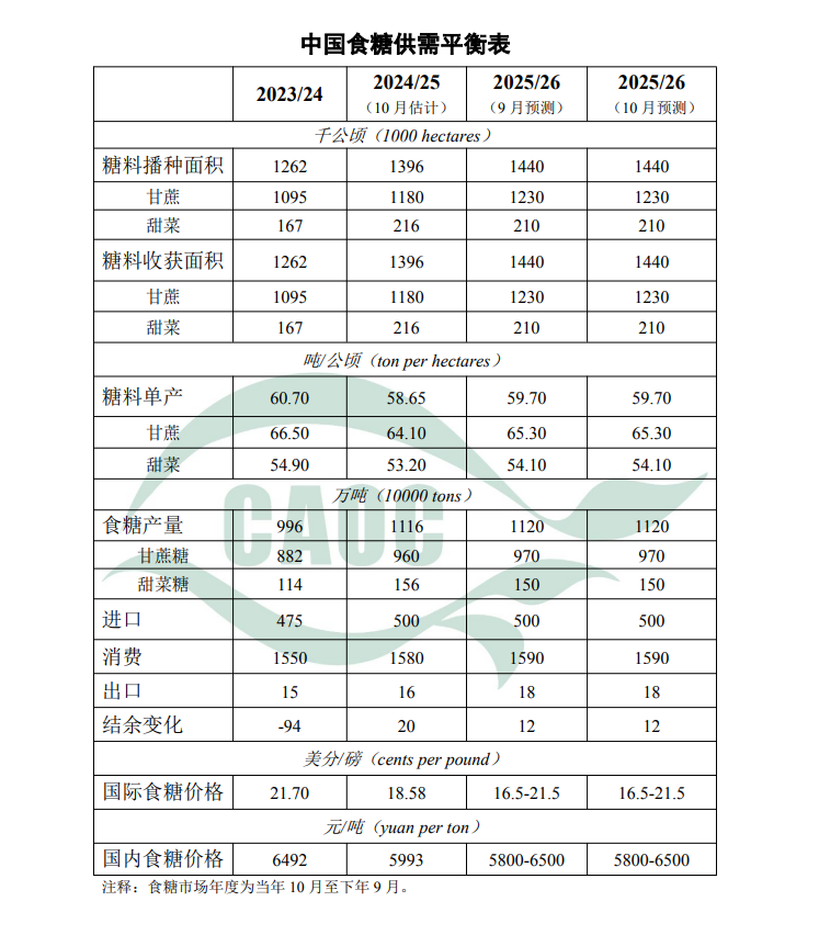 2024/25年度中國食糖產(chǎn)銷結(jié)束,累計產(chǎn)糖1116萬噸,較上年度增加120萬噸;食糖年度均價為每噸5993元,在預(yù)測范圍內(nèi),比上年度每噸跌498元,跌幅7.7%;國際原糖年度均價為每磅18.58美分,在預(yù)測范圍內(nèi),比上年度每磅下跌3.1美分,跌幅14.3%。本月對2025/26年度中國食糖供需形勢預(yù)測與上月保持一致。8月份內(nèi)蒙古降雨偏多,不利于甜菜糖分積累及起收,糖廠開機時間推遲,對甜菜糖產(chǎn)量的影響需進一步跟蹤評估。9月底10月初廣東、廣西等甘蔗主產(chǎn)區(qū)受臺風(fēng)影響,出現(xiàn)甘蔗倒伏等現(xiàn)象,后期需持續(xù)關(guān)注災(zāi)后甘蔗生長恢復(fù)情況。