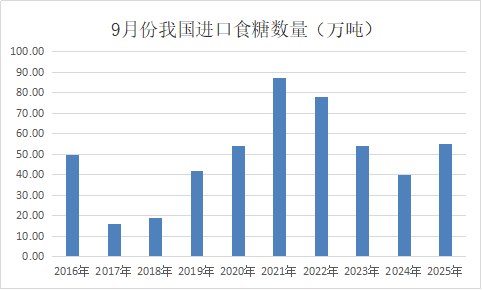 據(jù)海關總署公布的數(shù)據(jù)顯示,2025年9月我國進口食糖55萬噸,同比增加15萬噸,為近十年同期第三高的水平。其中白糖3萬噸,原糖51.76萬噸。