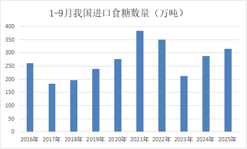 2025年1-9月我國累計進口食糖316萬噸,同比增加27萬噸,繼續(xù)保持在近十年同期第三高的水平。其中白糖22.55萬噸,原糖292.81萬噸。2024/25榨季我國累計進口食糖463萬噸,同比減少12萬噸。