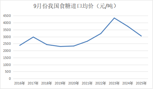 2025年1-9月我國進口食糖均價為3239元/噸(到岸價),同比大幅下降699元/噸,不過仍然是近十年同期第四高的水平,今年以來累計食糖進口均價逐月下降。