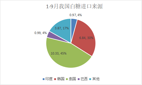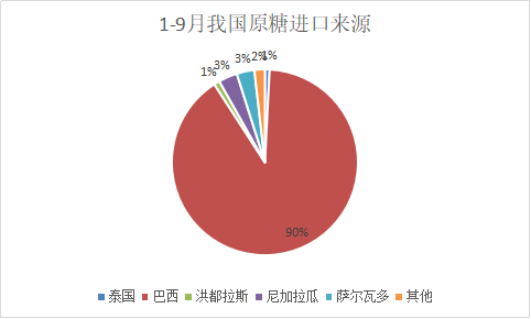 2025年1-9月我國進口食糖316萬噸,其中白糖23萬噸,從泰國進口最多10.33萬噸,其次是韓國6.84萬噸,第三從印度和巴西各進口約1萬噸保持不變;進口原糖293萬噸,其中從巴西進口最多263.81萬噸,占比高達90%,其次從薩爾瓦多和尼加拉瓜各進口9-9.6萬噸不變,還有2.91萬噸、2.4萬噸分別從洪都拉斯和泰國進口,9月份進口的約52萬噸原糖仍然幾乎全部來自巴西。