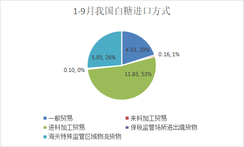 2025年1-9月我國進口食糖316萬噸,其中白糖23萬噸,進口方式主要是進料加工貿(mào)易11.83萬噸,占比53%,其次是海關特殊監(jiān)管區(qū)域物流貨物5.93萬噸,第三是一般貿(mào)易只有4.53萬噸;進口原糖293萬噸,大部分183.65萬噸通過一般貿(mào)易進口,占比63%,其次89.45萬噸為保稅監(jiān)管場所進出境貨物,占比30%,還有19.36萬噸海關特殊監(jiān)管區(qū)域物流貨物,占比7%。9月份進口的約52萬噸原糖大部分28萬噸通過一般貿(mào)易進口,另外新增16萬噸保稅監(jiān)管場所進出境貨物,還有約7萬噸海關特殊監(jiān)管區(qū)域物流貨物。