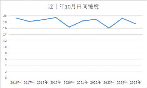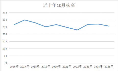 從五月的調研數據看,當時的株高是處于近15年的最低水平,前期受旱影響非常嚴重。但5月后良好的氣候條件使甘蔗生長加速,從10月的數據看基本回到了近10年的中值水平,但與去年同期相比依然偏矮14.36厘米。主要是因為遲來的降雨使得甘蔗在前期長勢慢,在5月份降雨后又進行補種,生長時間不夠,拉低了平均值。