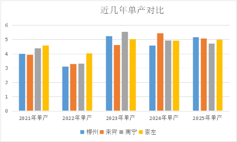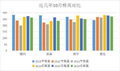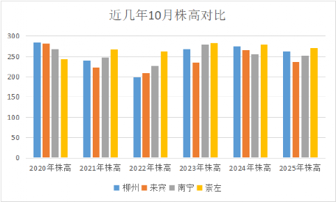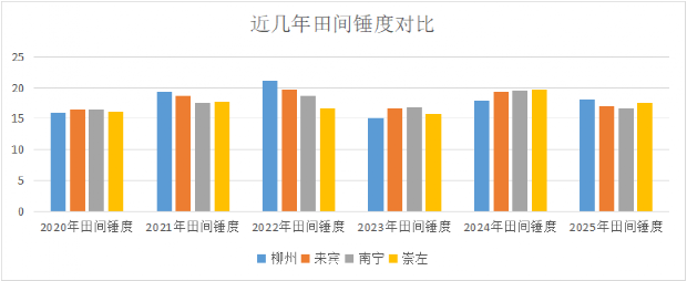 從各地市調研情況看,當下柳州的錘度最高,其次是崇左、來賓、南寧。但其實從測量數據看,只有柳州的田間錘度是略高于去年同期,其它三個地市的田間錘度都降低了2個點以上,特別是南寧,降低了近三個點,后期南寧的產量能否回歸正常值,無論是株高還錘度都很關鍵。