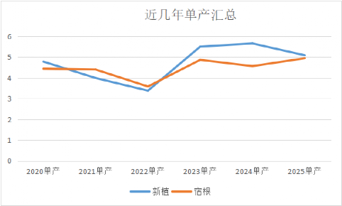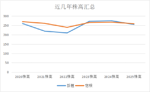 從新植蔗與宿根蔗的數據看,近幾年新植與宿根的株高相差不大,特別是今年新植與宿根的主要拔節生長期都在5月后,株高差距只有5厘米。但總體看,新植比去年同期矮了20厘米,宿根比年同期矮了8厘米,宿根蔗由于已經扎根較深,在5月份降雨下能夠陸續追回來,但是新植蔗種植下去就遇到干旱,導致今年不少新植蔗還需要補種,因此即使后期降雨較好,也趕不上去年同期的高度。