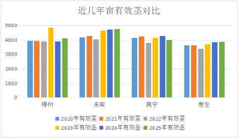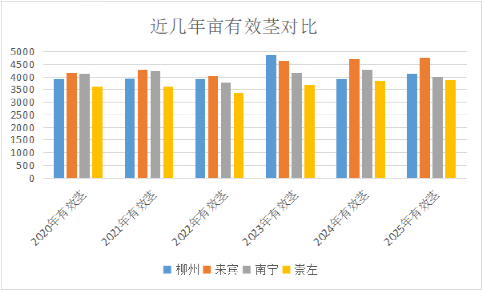 從各地市有效莖對比看,除南寧外,其它三個地市的畝有效莖均有一定程度的增加。在5月最重要的苗期,南寧的降水量是最少的,來賓次之,因此南寧的有效莖同比減少了270株,表現最好的是柳州,有效莖增加了220多株。歷年來有效莖數量最好的是來賓,有效的抵消了株高偏矮對單產的不利影響。而崇左由于品種的原因,歷年有效莖數都在四大地市中最少,但株高最佳,因此總體長勢依然是在偏好的水平。