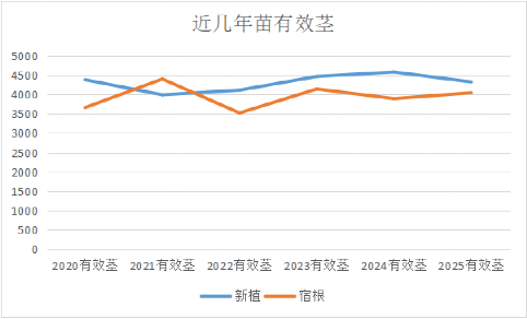在大多數年景中,宿根有效莖的表現總是不如新植,但其受到天氣的影響較小,總體成莖的穩定性好于新植。在今年10月的測量數據中,新植蔗有效莖同比減少了250多株,而宿根增加了150多株,雖然總體看新植蔗的有效莖比宿根蔗多300來株,但比重更大的宿根蔗對穩定產量的貢獻更大。