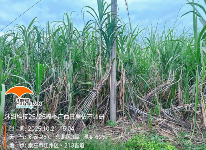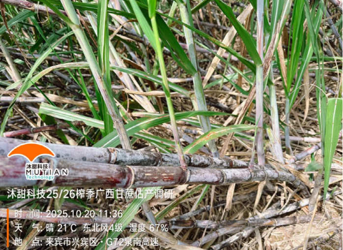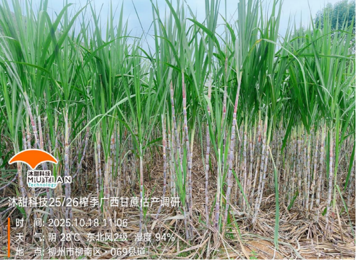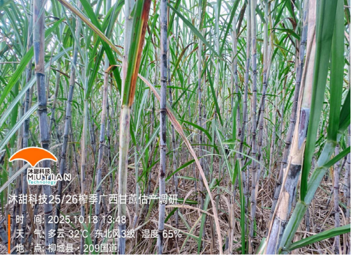 7-9 月:氣溫偏高(23.8℃~30.1℃)、日照充足(日均 6~8 小時),總雨量接近常年,但桂南偏多桂北偏少,總體契合甘蔗莖伸長期的生長需求,高溫強光利于光合產物積累與運輸,促進莖稈快速伸長、增粗,提升生物量;7、9月臺風帶來的降水補充土壤水分,但也造成部分蔗地漬澇,崇左和來賓等地蔗區受到一定程度的影響;8-9 月階段性高溫雖明顯但未突破甘蔗耐受極限,利于生長進程。