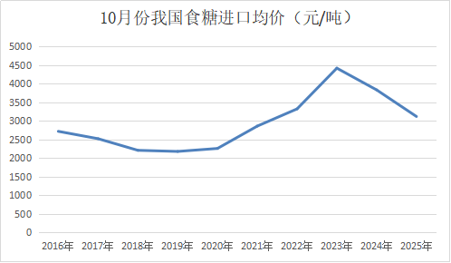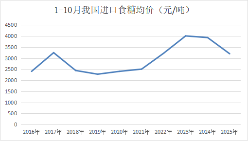 2025年1-10月我國進口食糖均價為3203元/噸(到岸價),同比下降730元/噸,降至近四年同期最低水平。