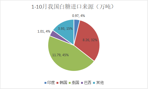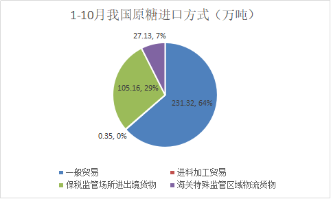 10月份進口的約71萬噸原糖大部分47萬噸通過一般貿易進口,另外新增16萬噸保稅監管場所進出境貨物,還有約8萬噸海關特殊監管區域物流貨物。