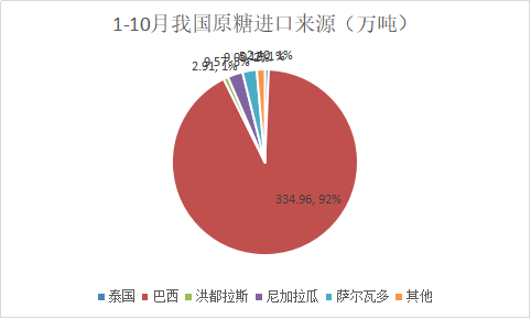 2025年1-10月我國進口食糖390萬噸,其中白糖25.96萬噸,從泰國進口最多11.97萬噸,其次是韓國8.26萬噸,第三從印度和巴西各進口約1萬噸保持不變;進口原糖363.96萬噸,其中從巴西進口最多334.96萬噸,占比高達92%,其次從薩爾瓦多和尼加拉瓜各進口9-9.6萬噸不變,還有2.91萬噸、2.4萬噸分別從洪都拉斯和泰國進口,10月份進口的約71萬噸原糖仍然幾乎全部來自巴西。
