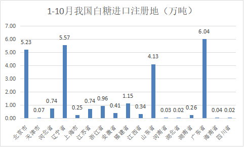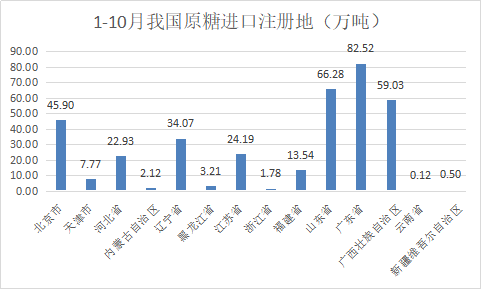 10月份進口的約71萬噸原糖其中北京20萬噸、廣東18萬噸、遼寧9萬噸、天津8萬噸、山東7萬噸、廣西6萬噸,還有內蒙古和黑龍江也有1.5-2.5萬噸。