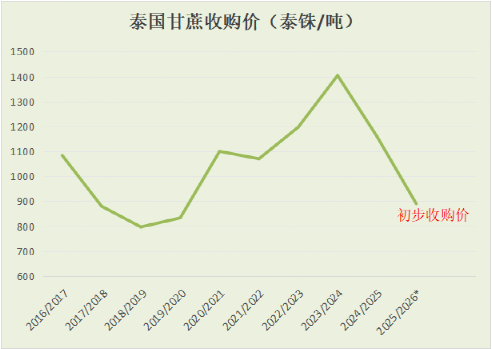 泰國政府公布的25/26榨季甘蔗收購價為890泰銖/噸,同比下降23%,創近10年最低。據有關機構測算,部分農戶種植甘蔗的收益已不及木薯,開始將受病蟲害影響的甘蔗田改種木薯,或導致26/27榨季甘蔗種植面積縮減。