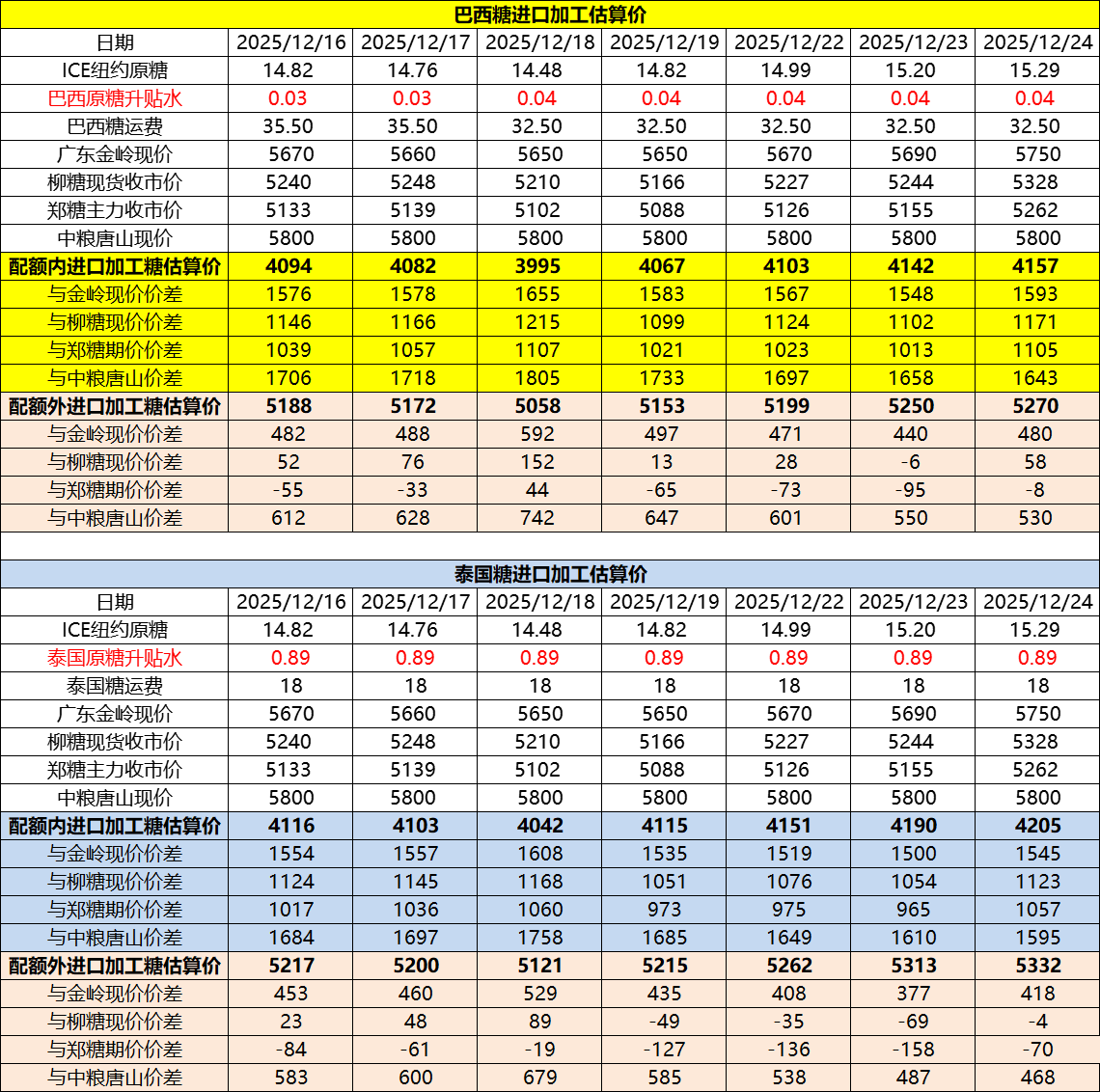 巴西泰國(guó)進(jìn)口糖升貼水、運(yùn)費(fèi)及加工成本(12月25日更新)