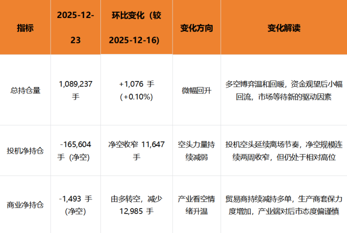 截至 2025 年 12 月 23 日,CFTC 原糖交易商持倉補充報告數據顯示,市場持倉結構延續調整態勢,投機空頭持續獲利了結推動凈空規模進一步收窄,商業端持倉微調反映產業端謹慎情緒未改: