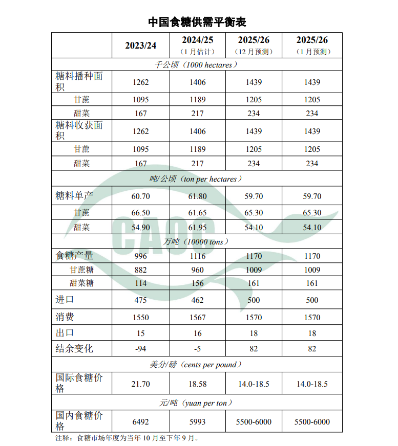 本月對2025/26年度中國食糖供需形勢預測與上月保持一致。目前北方甜菜糖生產進入尾聲,南方甘蔗糖生產進入高峰期,國內新糖集中上市,市場供應充足,下游終端商戶隨用隨采。截至12月底,廣西累計產糖194萬噸,產銷率45.56%,同比下降13.76個百分點;云南累計產糖39萬噸,產銷率71.72%,同比下降9.98個百分點。后期需持續關注天氣變化對甘蔗含糖量的影響。國際方面,印度、泰國增產預期較強,巴西產糖維持高位,國際食糖供需寬松。
