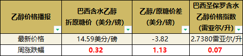 受強勁需求及賣方挺價的影響,近期巴西CEPEA/ESALQ含水乙醇平均價格指數漲至23年3月以來最高水平,上周圣保羅工廠的含水乙醇成交量也達到本榨季以來最高水平。巴西含水乙醇折原糖價格亦上漲至14.59美分/磅。